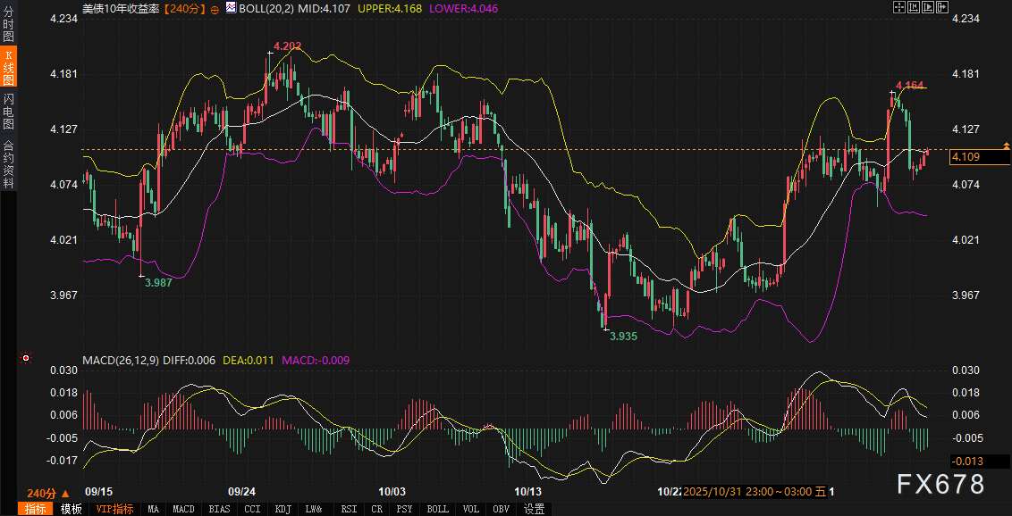 展望未来,美债与美元的盘面将围绕美联储储备扩张的“度”展开渐进博弈。短期内,10年期收益率或在中轨4.107附近寻求平衡,若回购压力持续,威廉姆斯预期的购债启动将提供下行缓冲,推动其测试下轨4.046的支撑位。同时,美元指数的99.85水平面临通道收窄的风险,MACD动能的钝化暗示,若债市收益率回落,其上行动能将进一步受抑,潜在回撤至下轨99.6579。