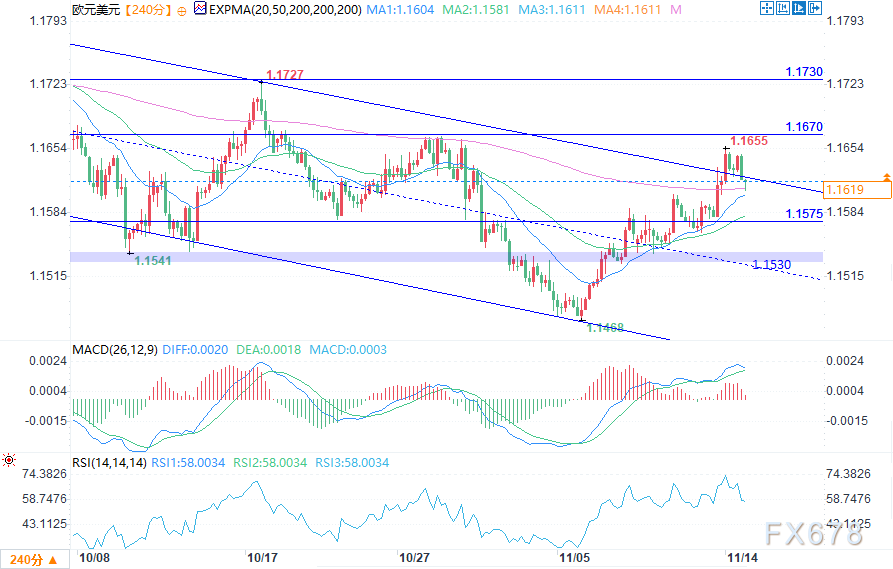 汇通财经APP讯——周五(11月14日)欧盘时段,欧元/美元在连续七个交易日上涨后缩减涨幅,发稿时交投于1.1615